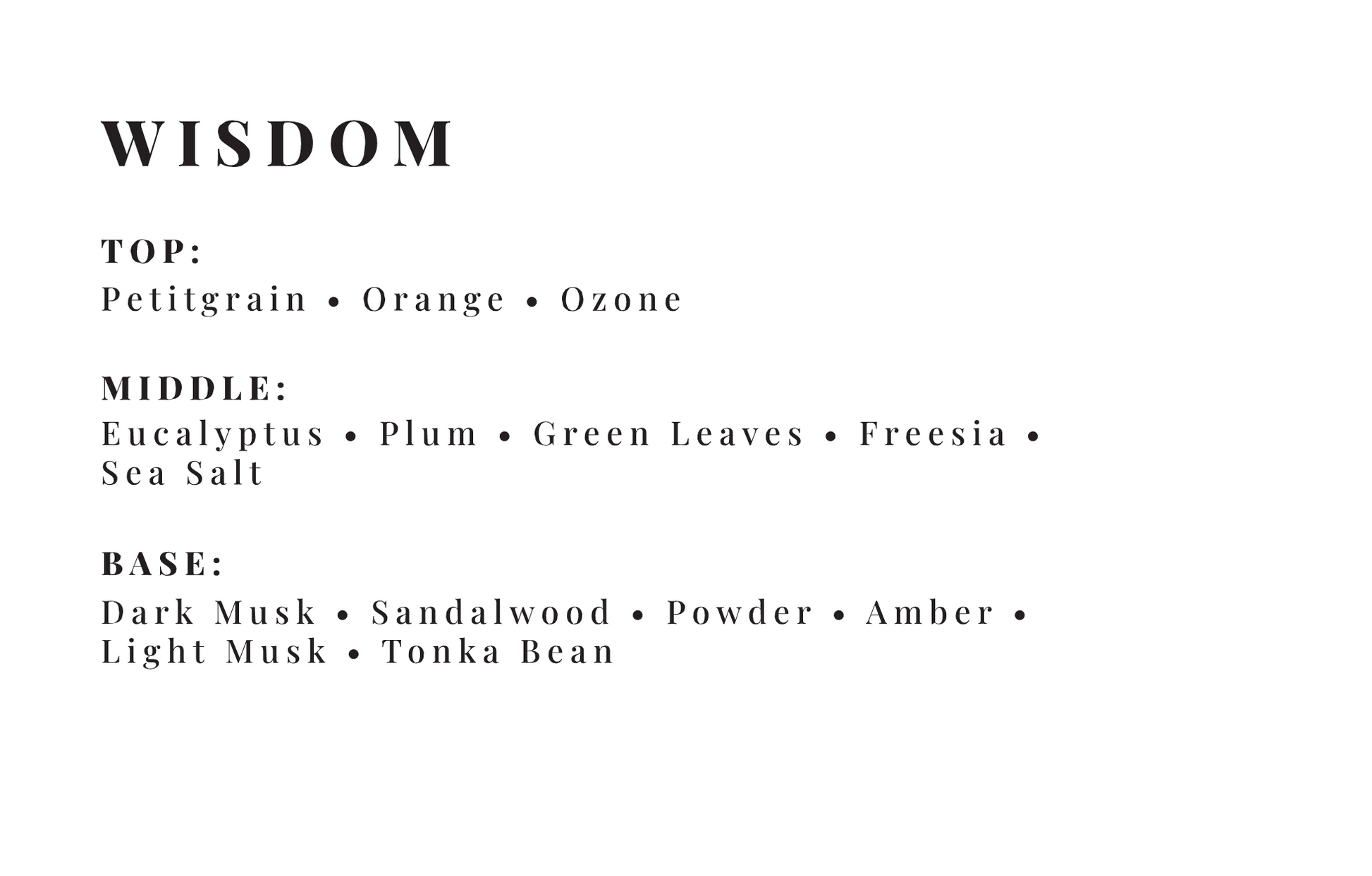 Inspired by the serene landscapes of Palm Springs, Wisdom captures the essence of calm and clarity. The fresh, uplifting notes of orange and petitgrain drift on a breeze of ozone, while sea salt and eucalyptus evoke memories of peaceful desert mornings. As the scent deepens, warm sandalwood and musk ground the experience, leaving a soft, lingering trail of amber and tonka bean.